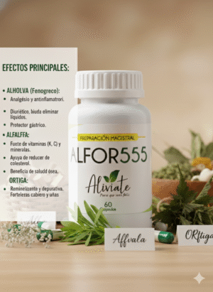 Descripción General: ALFOR 555 es una innovadora fórmula magistral diseñada para promover el bienestar general, combinando el poder de tres plantas con reconocidos beneficios para la salud: Alholva (Fenogreco), Alfalfa y Ortiga. Esta sinergia de ingredientes naturales está especialmente formulada para ofrecer un soporte integral a diversas funciones del organismo, siguiendo los principios de la medicina natural y tradicional.
